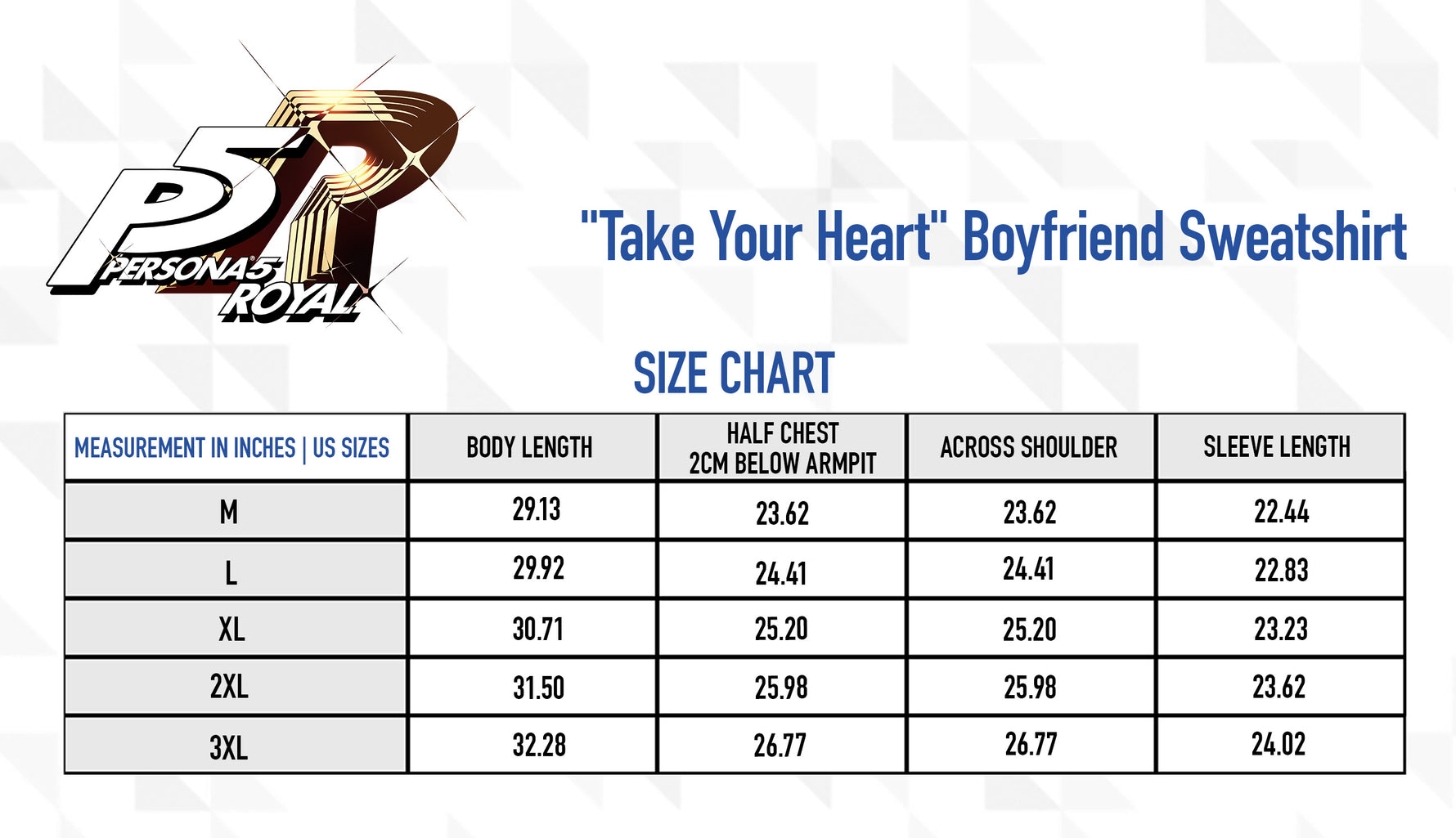- Design: Bold Persona 5 Royal “Take Your Heart” back print with Joker’s mask & hat; repeating sleeve graphics